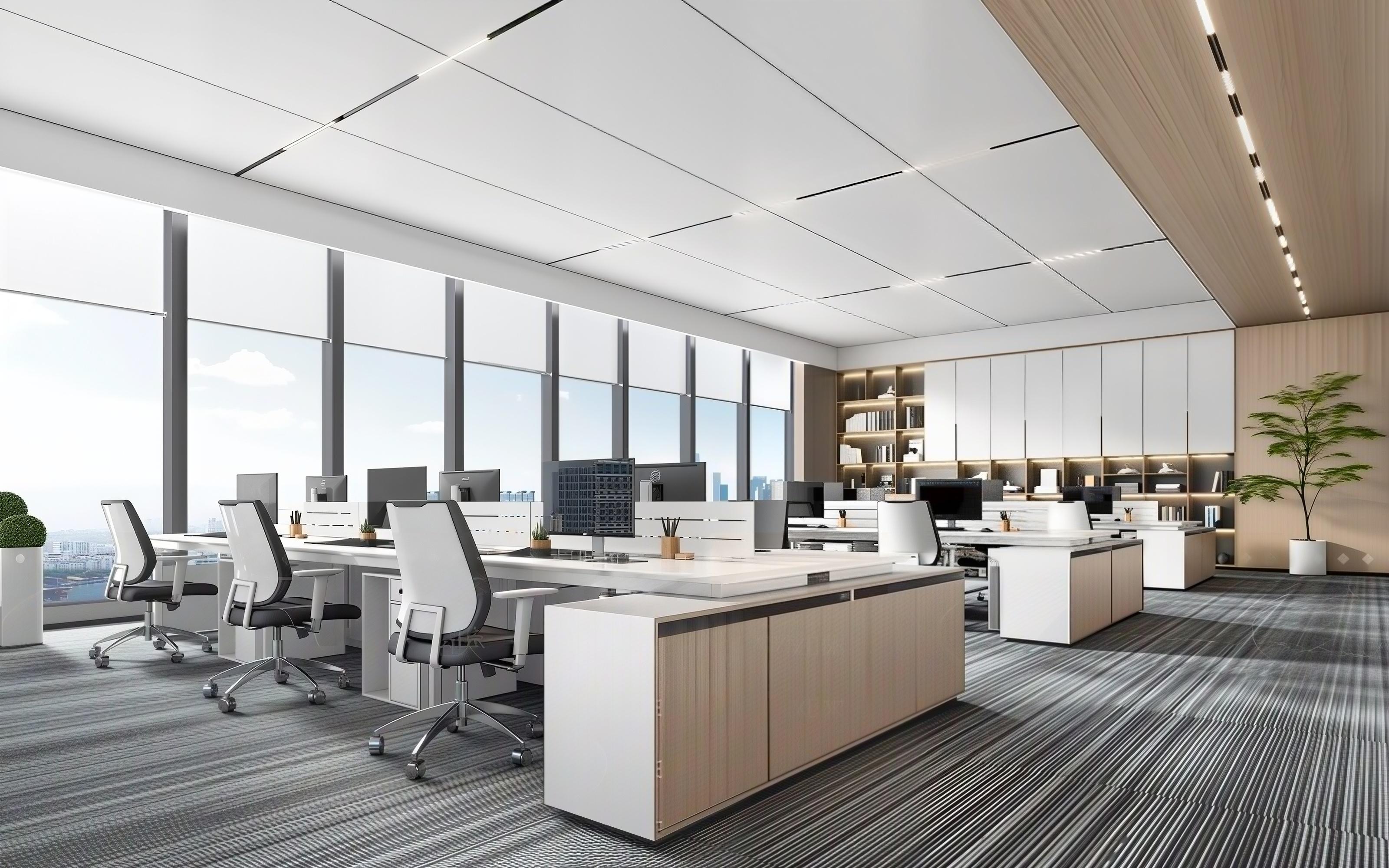 1. 顶天立地收纳柜:安装于角落/对面墙面,与顶面齐平,宽≤墙面60%;上层封柜放闲置,中层半开放放常用文件/设备,下层抽屉放办公用品,按压式无把手,与墙面同色。